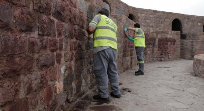 Temizlendikten kısa bir süre sonra yeniden kent vandallarının hedefi olan Başkent’in simgelerinden tarihi Ankara Kalesi’nde, yeniden temizlik çalışması başladı.