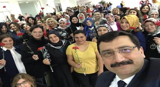Kadınlara karanfil dağıtan Ak, programa katılan tüm kadınlarla selfie çekti.