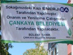 Kazı çalışması yapan firmanın, herhangi bir bilgilendirme tabelası koymadığını ve güvenlik önlemi de almadığını kaydeden bölge sakinleri, “Toz toprak içinde kaldık” diye sitem etti. Altyapı çalışmalarının Çankaya Belediyesi ile ilgili olmadığını belirten belediye yetkilileri ise çareyi “Kazı çalışmaları EnerjiSa tarafından yapılmıştır. Yenileme ve onarım çalışmaları Çankaya Belediyesi tarafından yapılacaktır” yazılı pankartı asmakta buldu.ANKARA /