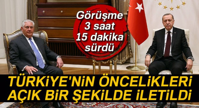 Cumhurbaşkanı Recep Tayyip Erdoğan’ın ABD Dışişleri Bakanı Rex Tillerson'ı kabulünde, Türkiye'nin öncelikleri ve beklentileri açık bir şekilde Tillerson'a iletildi.