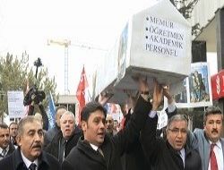 Türk Eğitim-Sen üyeleri, öğretmen ve akademisyen maaşlarında iyileştirme yapılmadığı gerekçesiyle Maliye Bakanlığına maket tabut bıraktı.