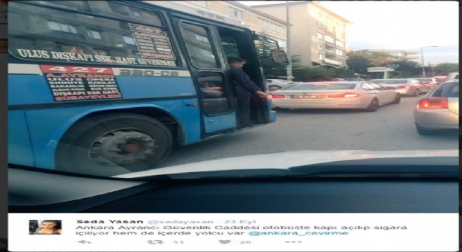 Öte yandan Güvenlik Caddesi’nde seyir halindeyken ön kapısı açılıp, sigara içildiğiiddia edilen Ulus-Güvenpark güzergahında çalışan 427 numaralı otobüsle ilgili paylaşıma, attığı tweet’le yanıt veren Özel Halk Otobüsleri Odası Yönetim Kurulu Üyesi Ahmet Karakurt da, “Sigara içen personel cezalandırılmak üzere EGOKomisyonu’na sevk edilmiştir. Duyarlılığınız için teşekkürler” dedi.