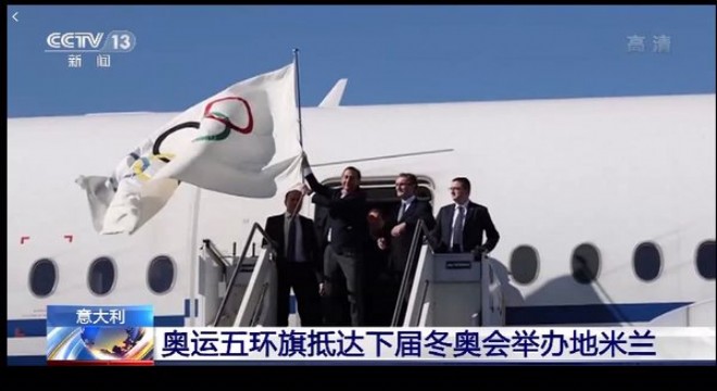Milano’nun Malpensa Havalimanı’nda Milano Belediye Başkanı Giuseppe Sala ve Cortina d’Ampezzo Belediye Başkanı Gianpietro Ghedina olimpiyat bayrağını sallayarak uçaktan indiler.