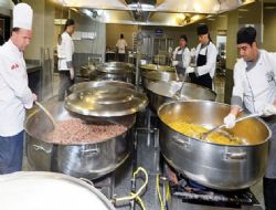 ANKARA / Büyükşehir Belediyesi’nin Başkent’in yedi ayrı noktasında kurulan iftar çadırlarında her gün 9 bin kişiye verdiği yemekler, EGO Genel Müdürlüğü’nün mutfağında hazırlanıyor. Büyükşehir Belediyesi personeline de hizmet veren mutfakta, Ramazan ile birlikte yoğun bir mesai yaşanıyor. Mutfakta 50 kişilik bir ekip sabah saat 08.00’de yemek yapmaya başlıyor. Üç vardiya halinde çalışan uzman aşçılar, tatlısından salatasına kadar tüm yiyecekleri iftar saatine yetiştiriyor. Bolulu Başaşçı Sabri Murat’ın gözetiminde her gün farklı bir menüde, dört çeşit yiyecek hazırlanıyor. Menülerde, çorbadan zeytinyağlılara, hindiden çökertme kebabına kadar değişen çeşitler ile pilav veya makarna, salata veya tatlılar yer alıyor.