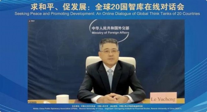 Le Yucheng, dün 20 ülkeden düşünce kuruluşlarının katılımıyla düzenlenen çevrim içi diyaloğa katıldı.